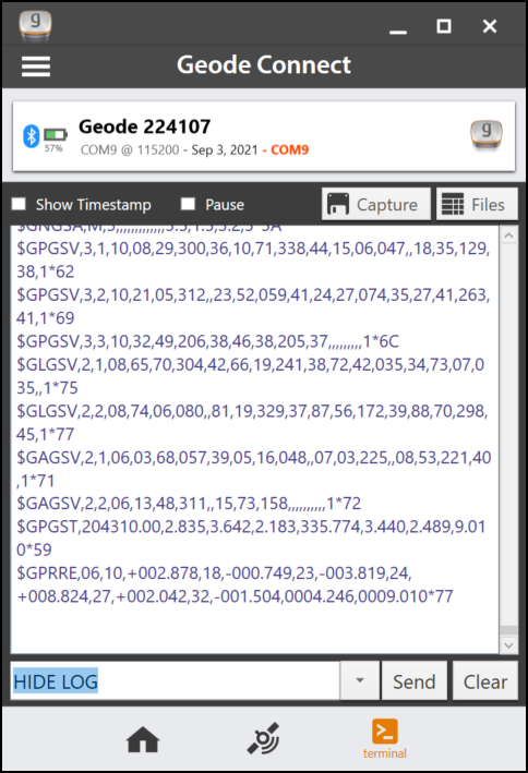 If you should want to change the serial port to a baud rate not listed in Geode Connect, you can use the terminal screen in Geode Connect to do so. If you would like details of the the terminal commands, please see Geode Terminal Commands.