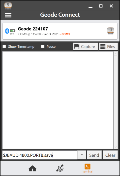 - Enter $JBAUD,####,PORTB,save if you are connected to your Geode by any means other than the serial port. (Replace the #### with your desired baud rate.) WARNING: Port B is the serial port. Do NOT send a speed change to any other port as it could disrupt your ability to communicate with the receiver.