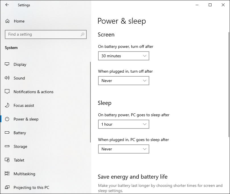 - Select Power & sleep from the column on the left of the Settings screen. Set the Screen and Sleep timers as listed below.