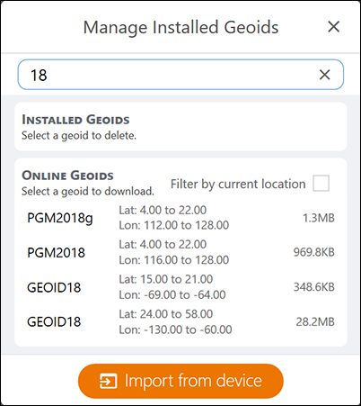 - Use the import from device button to select a Geoid you have saved on your device.