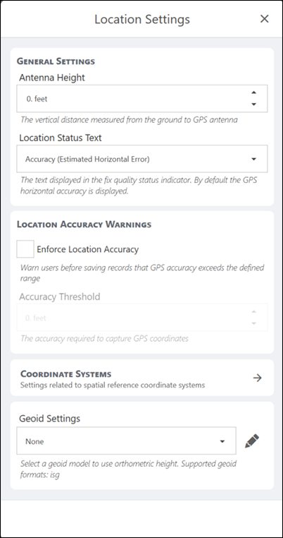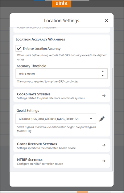Enable Enforce Location Accuracy to receive warnings in Uinta when attempting to save records with GPS accuracy exceeding the defined range. When Enforce Location Accuracy is enabled set the Accuracy threshold used to capture GPS coordinates. |